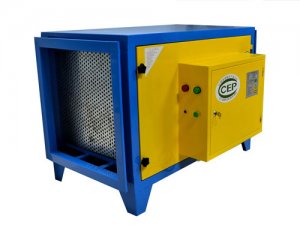 油烟净化器为二段式静电吸附型,它的二段式是指电离段与收集段,每个电离段由一系列SUS304材料锯齿组成。安装在一系列接地板中间,并通给高压直流电。大气中的微粒在通过电离器的静电场时,被电离并带有正或负电荷。每个收集段由很多数量的平行板组成,通以高压直流电(极性与电离器一致,但电压减半)以形成电场,带电微粒被接地板吸引的同时也受到带电的驱赶,因此油烟颗粒雾可以被去除以上污染物被滤除,能收集大于0.1微米的颗粒。
